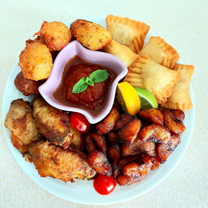 accras, samoussas, pastels, petite barquette de banane plantain frit